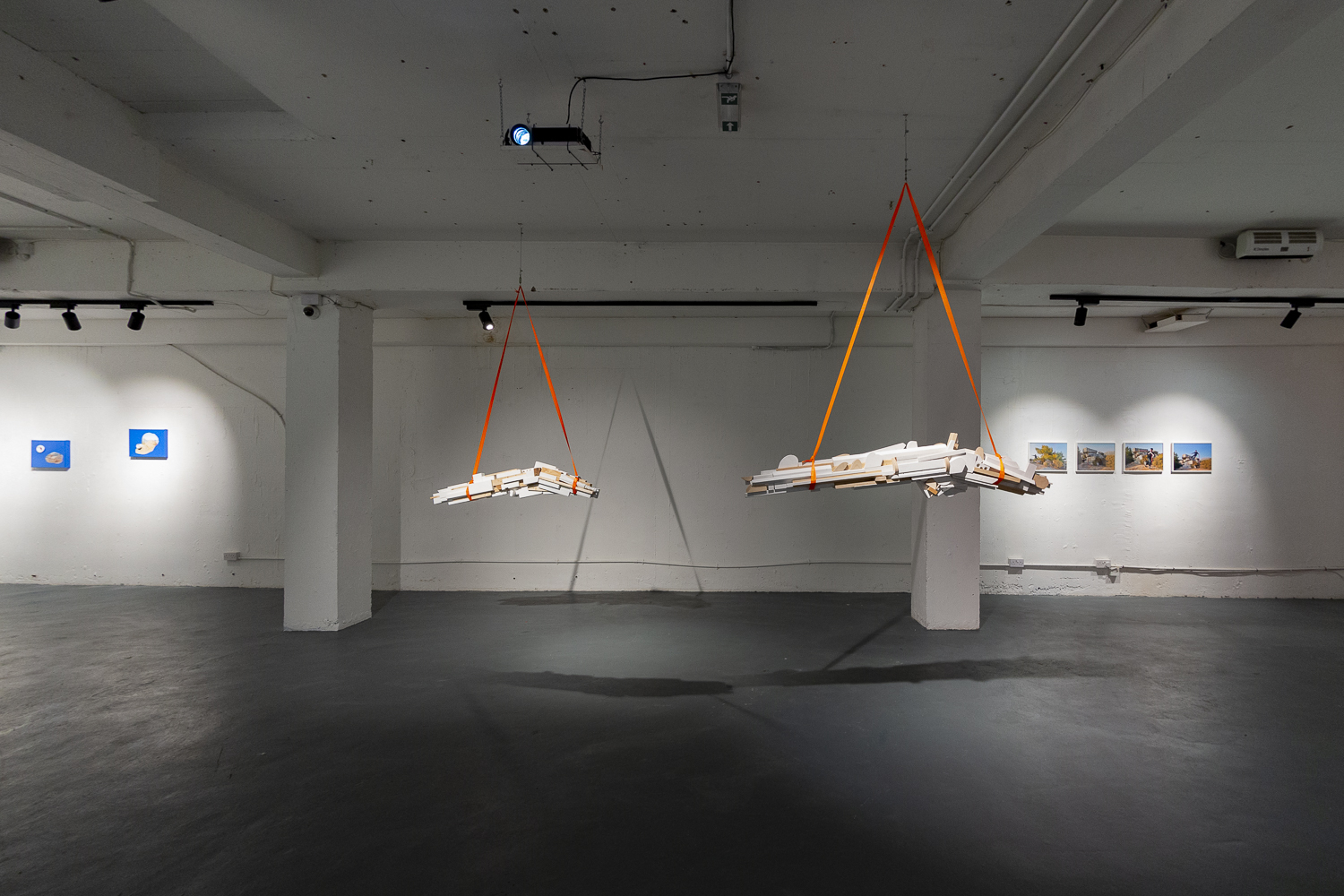 The Guns is a project by Dejan in which I helped. I began by working on the wood. He had found a lot of leftover wood, which I processed and prepared. I used various tools to see how I could finish and paint these pieces neatly. This was done with more than 100 different pieces. Then we assembled the gun, piece by piece, reacting to what we already had in front of us, and painted the pieces. We also played with displaying them in the studio. We started with holding, hanging, and lying them down. It was meant to resemble a fireplace where weapons used to hang. Dejan also wanted to involve performance art, and I got to do that. We experimented with different poses and movements, imagining what it would be like if there were a live fire in the fireplace and if it moved. For this, we tried many different poses and movements. Ultimately, we decided to hang them from the ceiling to create a sensation of wanting to touch them.