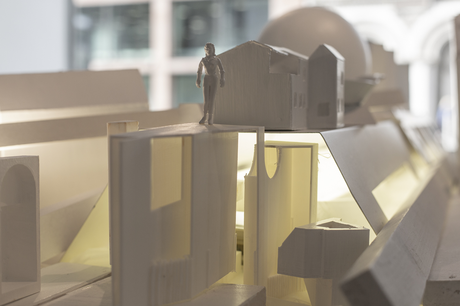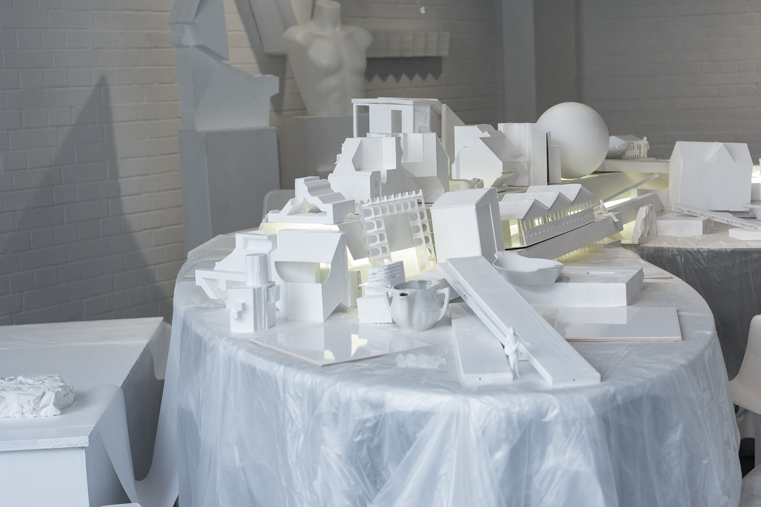 White Dinner is a performance by Ursula. This is the second time she organized it, now open to the public. The first time was held during the COVID-19 pandemic in the studio. In the exhibition, it is now displayed as a sculpture on the first floor, and the performance took place there later. White Dinner represents the tunnel between life and death, a moment of silence, rest, and critique. This dinner was focused on critiquing architecture. Therefore, we arranged the table with different white models and maquettes and created a composition. I started two weeks before, working on models and painting them. Ursula collected old models from the school where she works, and I worked on each one, making them look neat and painting them in stark white. We set up the tables together and built it from there.