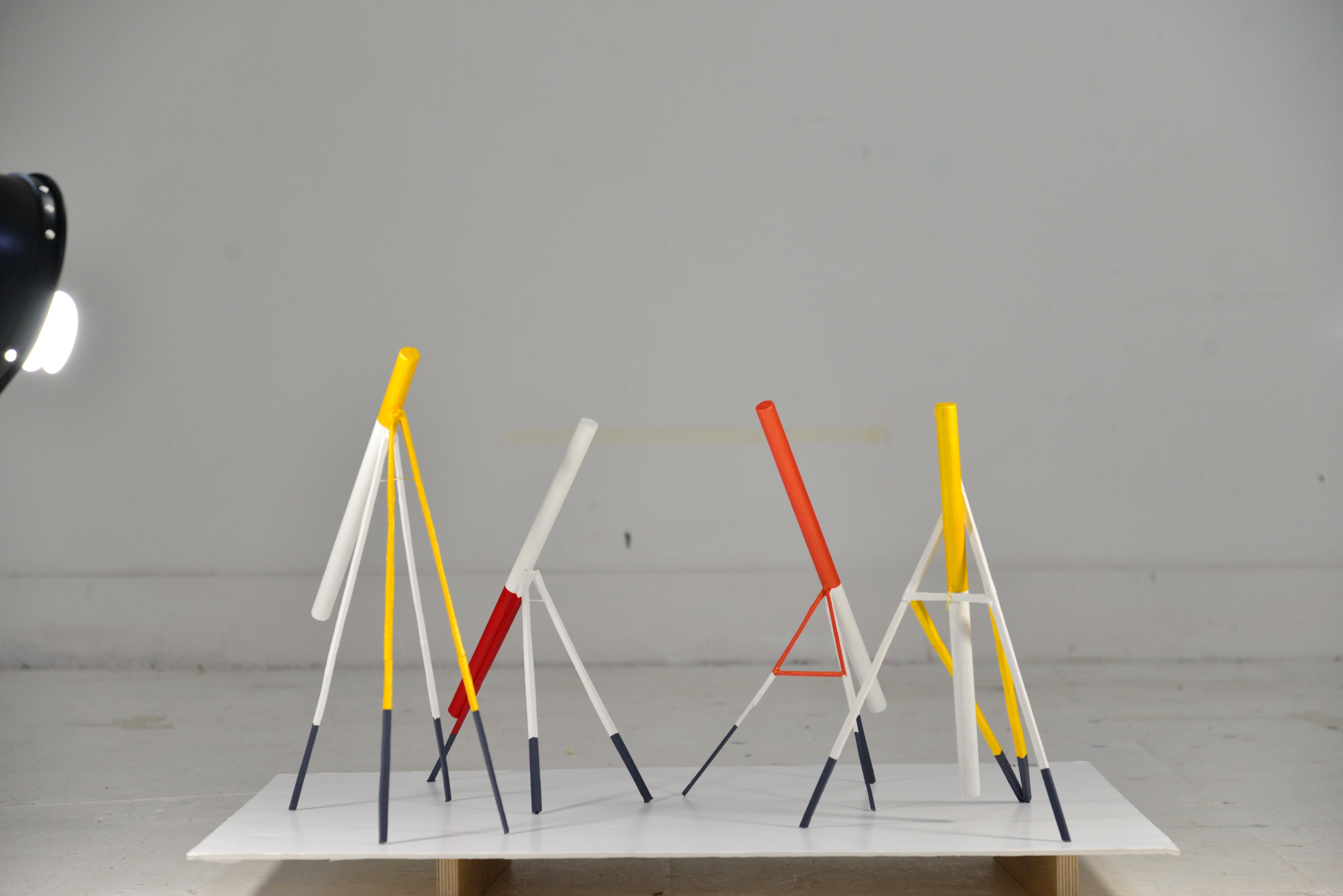 At Studio Syn_, they frequently use foam as the base for their models and maquettes. These can be blocks or sheets. They are cut in a special way using a machine with a heated metal wire that burns through the foam. This allows you to create straight lines or curves. It turned out to be quite a task to do this properly. Additionally, foam is a sensitive material that reacts to different adhesives and paints, sometimes melting. Blocks are used to create large buildings and models, while sheets are used to build landscapes. I used this method to create the Kite models, train models, and a house, each requiring a different approach.