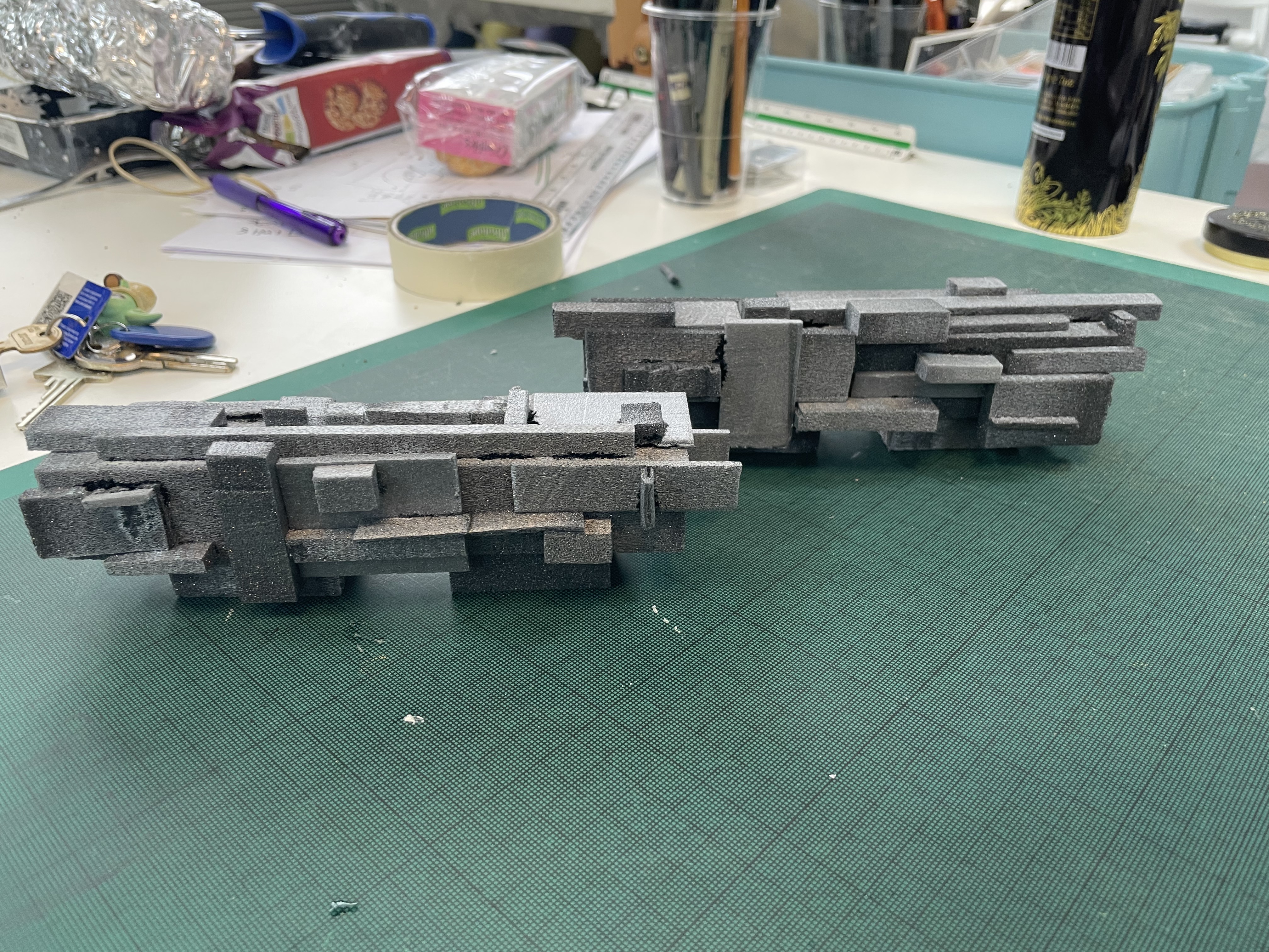 Bij Studio Syn_ gebruiken ze heel vaak foam als basis voor hun maquettes en modellen. Dit kunnen blokken of lagen zijn. Deze wordt ook op een speciale manier gesneden met een machine. Deze heeft een metaaldraad wat heet wordt en daarmee brand je door de foam heen. Hiermee kan je rechte lijnen maken or juist rondingen. Het bleek nog een klus te zijn om dit goed te doen. Daarnaast is foam een heel gevoelig materiaal wat reageert op verschillende lijmen en verven en dan smelt. Met de blokken maak je grote gebouwen en modellen terwijl je met de platen heel mooi een landschap kan opbouwen. Ik heb deze methode gebruikt om de Kite modellen, de trein modellen en een huis te maken, elk van deze vroeg om een andere manier van toepassen.