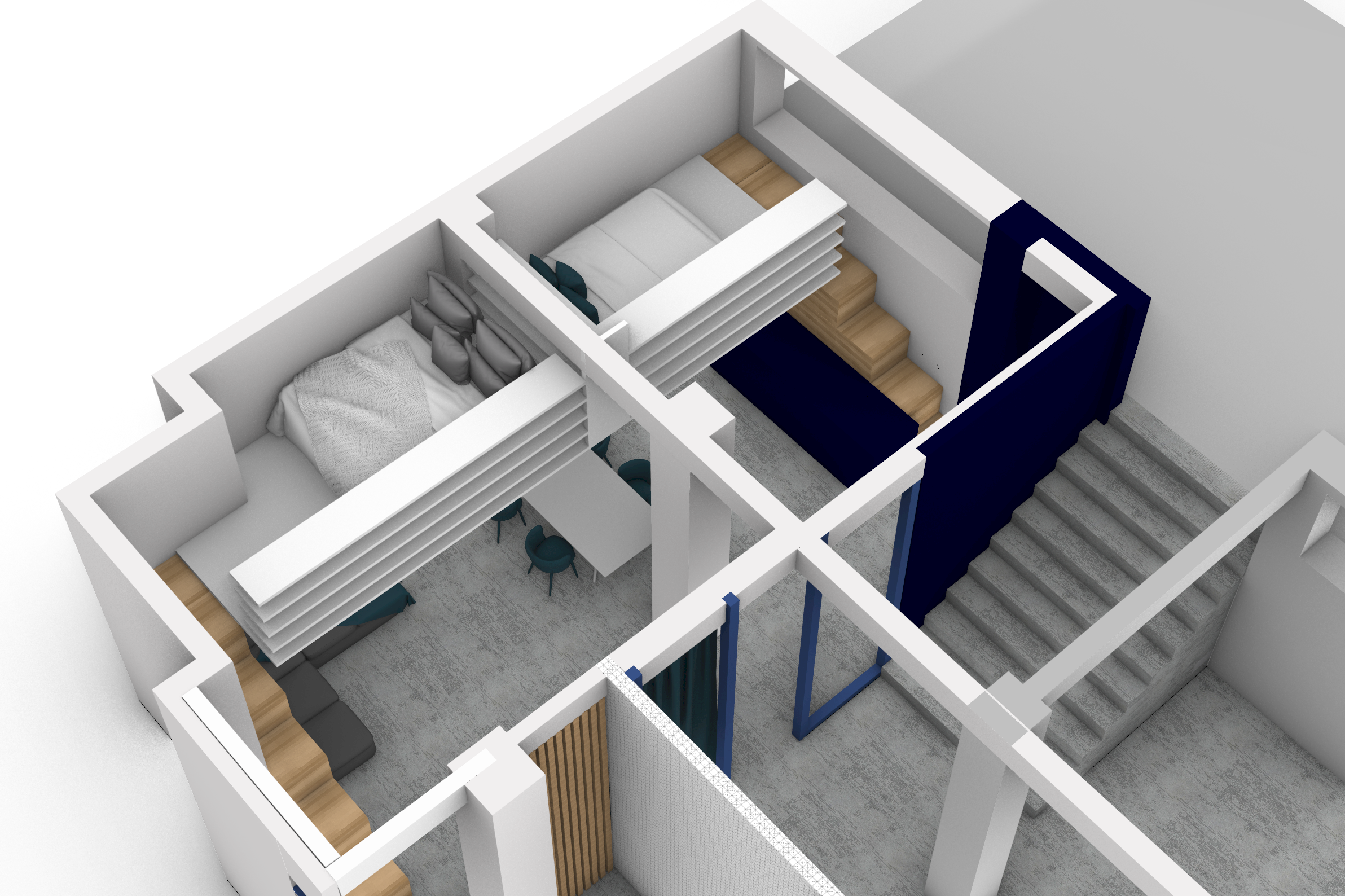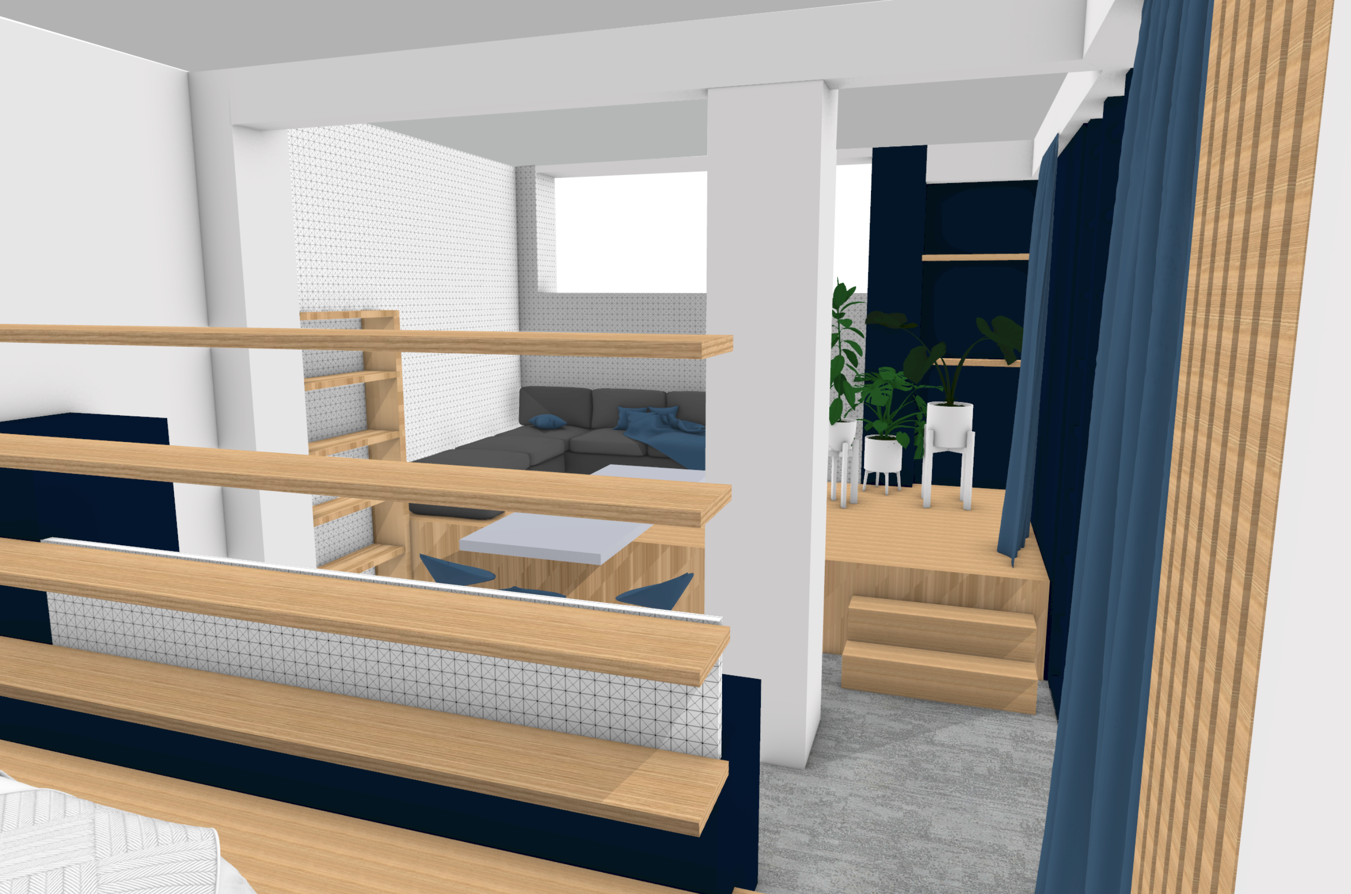 At the beginning of my internship, I had to learn a new computer program, Rhino 7. This is a 3D program that works with four different views. In contrast to Vectorworks, where I mainly worked with floor plans, Rhino starts with volumes. This was a challenging shift for me because it requires a different approach to designing. However, it offers more rendering possibilities with textures and color usage. I used this program for various projects, especially the interior design of Stathmos.