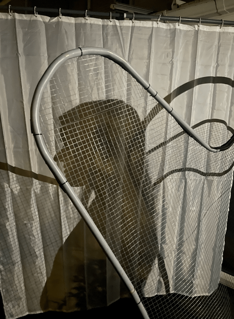 The path is determined by multiple routes along movable set pieces. The shapes of these pieces are inspired by various stages in the journey of life. At the beginning and end of the path, these shapes are more convoluted, while they become more streamlined in the middle. The number of curves and bends refers to the way one draws at a certain age. If you are very young or very old, you have less control over your pencil, resulting in more extreme shapes when drawing compared to those in the middle of life with more control over their hands and actions. The objects consist of frames covered with mesh that you can stand behind, providing a sense of protection. Curtains are hung behind these frames, serving as projection screens. The moving players cast shadows from the frames onto these screens with their light suits. Players determine the “films” on the screens with their walking patterns and movements. Thus, the walkers also take on the role of directors, as they can decide what others see. Players can also stand behind the set, becoming part of the game and the projection. Your role is not predetermined and can switch between player, director, and spectator.