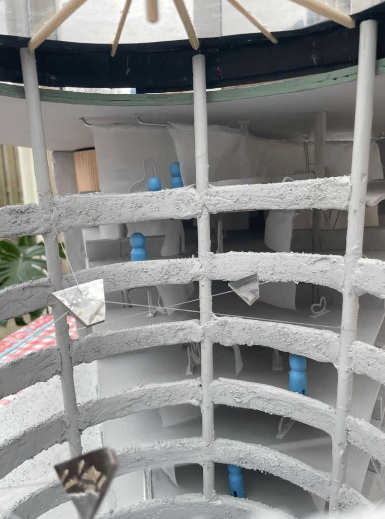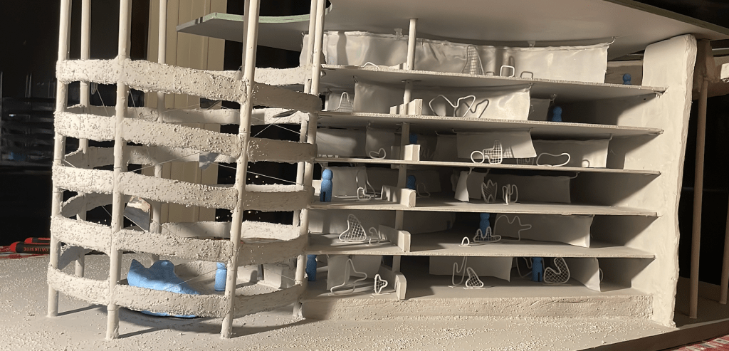 Voor het vak Interieur heb ik de levensloop ontworpen in een parkeergarage in Harderwijk. Deze opdracht was heel vrij, je moest een bestaand gebouw kiezen en daar iets in ontwerpen aan de hand van je visie. Ik heb gekozen voor een parkeergarage in Harderwijk omdat deze een bijzondere constructie heeft. Hij is cilindervormig met een open centrum in het midden, hetgeen hele interessante zichthoeken geeft. Ook raakte ik geïnspireerd door alle beweging die in het gebouw plaatsvindt. Er rijden constant auto’s naar boven en beneden, ook zijn er fietsers en brommers. Daarnaast is er ook een constante stroom van mensen die van en naar hun auto lopen en liften die naar boven en beneden gaan. Dit zag ik als een dansvoorstelling in de ruimte en dit was ook één van de redenen, waarom ik dit gebouw heb gekozen.